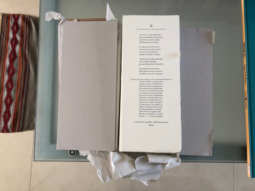 Antes de invitar a ver las imágenes de la edición del soneto, quisiera citar el testimonio del propio Juan Pascoe sobre el origen de su interés en componer e imprimir algún texto de Juan Almela-Gerardo Deniz (1934-2014). (Y todavía antes me permitiré recomendar a quienes leen que echen un vistazo a los materiales que hay en línea y que fueron producidos para acompañar el premio al Bibliófilo del Año que la Feria Internacional del Libro de Guadalajara le otorgó a Pascoe en 2014, tal como me lo recomienda David.) Esto es lo que me respondió el fundador del Taller Martín Pescador cuando le agradecí por escrito el finísimo trabajo realizado con el poema de Deniz y lo felicité por el resultado: