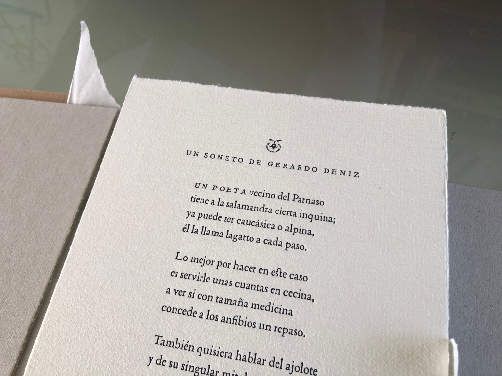 «Siempre veía que [Roberto] Rébora y [la editorial artesanal] Ditoria le imprimía libros a Deniz; me gustó tu nota original en el blog —yo también sé cuáles son las diferencias entre los reptiles y los anfibianos—. Vi que era mi oportunidad. Creo que encontró una forma tipográfica sencilla y lógica, pero única. Mi maestro de imprenta dijo una vez que era difícil hacer que los sonetos se vieran bien en los pliegos; en este caso la nota permitió añadir lo suficiente para que la unidad tomara el espacio como si no costara nada de trabajo» (correo electrónico del 25 de noviembre de 2019).