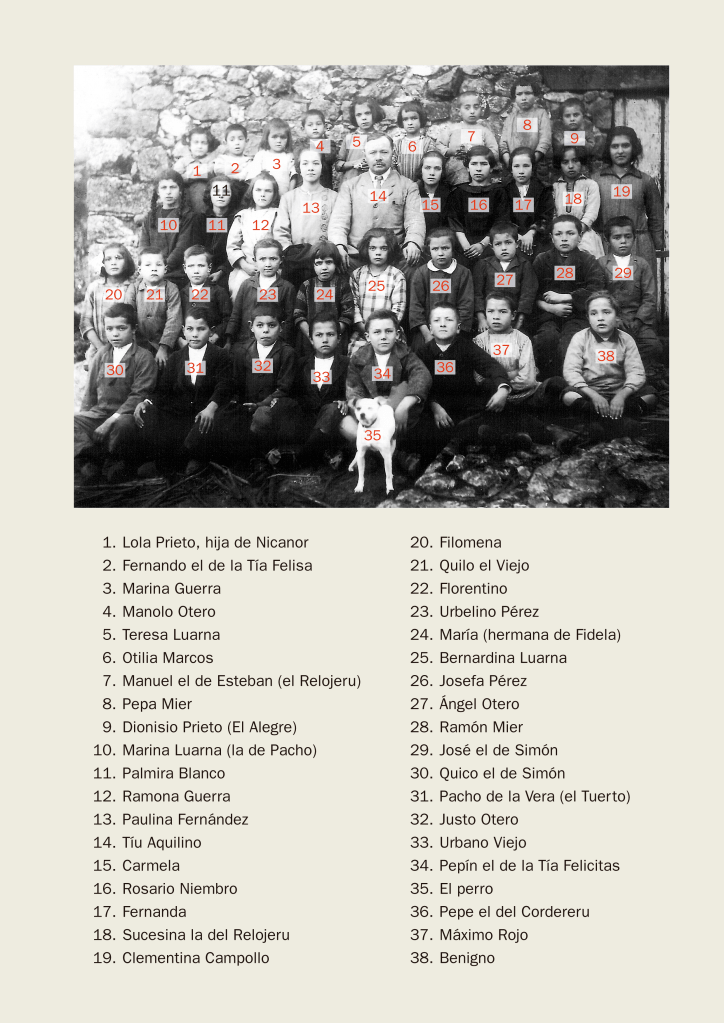 Mi primo Félix (Felisín, en Oriundos) me pide que publique la foto del maestro de Asiego de Cabrales y los niños de su clase con todos los nombres de quienes aparecen en ella. Quiere decir que no sólo con los nombres de los que se mencionan en mi libro, ya sea porque son personajes protagónicos, sirven de referencia para ubicar a otros personajes o asoman fugazmente a algunas de sus historias —y por ello están consignados en una de las primeras páginas, al lado de la reproducción de la foto (y aun al reverso de la postal que incluimos en la edición española de Oriundos y hemos incluido también en la segunda edición mexicana, a punto de empezar a distribuirse).