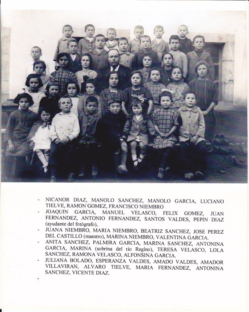 Pero a lo que iba. Reproduzco la foto del Tío Aquilino de Asiego, rodeado de los niños de su clase, con los carteles numéricos correspondientes colocados en su sitio por mi amiga y socia Lola García Zapico. La idea es, desde luego, cumplir con la petición de mi primo Felisín; también, satisfacer la curiosidad de todos los que, especialmente en Cabrales, se asomen a esta entrega de Siglo en la brisa.