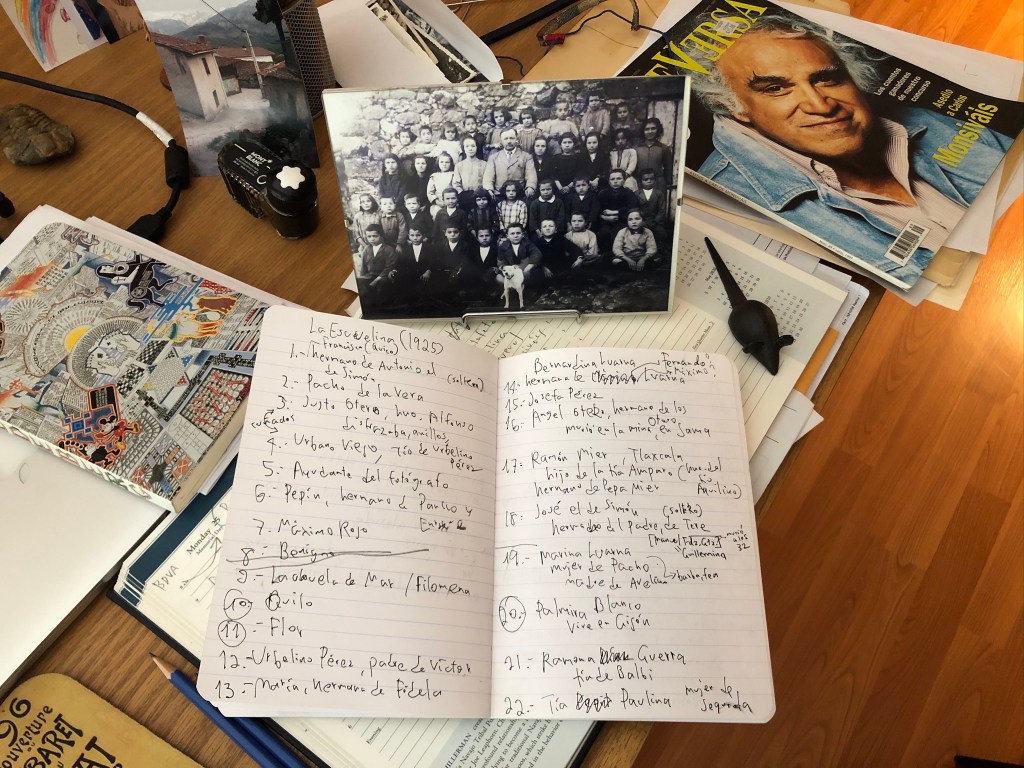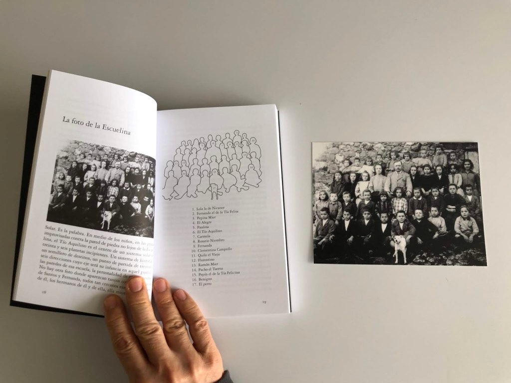 Félix me pone como ejemplo la foto del maestro y los niños de Puertas de Cabrales que está en su casa familiar en ese pueblo vecino de Asiego, a la que alguien añadió, a máquina de escribir, una lista con los nombres de todos los que rodearon aquella vez al señor maestro. (Las diferencias entre ambos pueblos, reflejadas en las fotos de diversas maneras, son dignas de un pequeño análisis que tendrá que quedar para otra ocasión.)