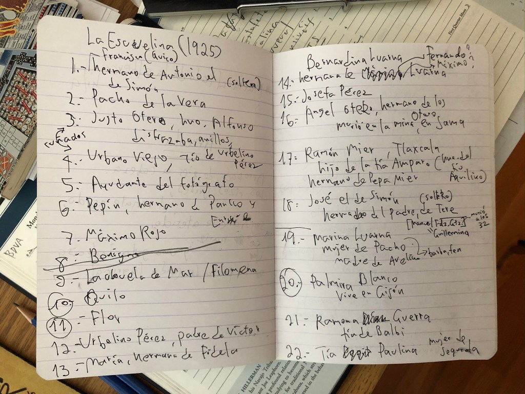 Copio los nombres de los niños de Asiego (Asiegu, en asturiano) de uno de mis cuadernos, de la lista que fui confeccionando un mediodía de noviembre de 2003 al dictado de Guillermina, la abuela de mis amigos Javier y Manolo Niembro, sin duda la persona más notable de cuantas conocí en mi paso por el pueblo y a quien está dedicado enteramente uno de los capítulos de mi libro.