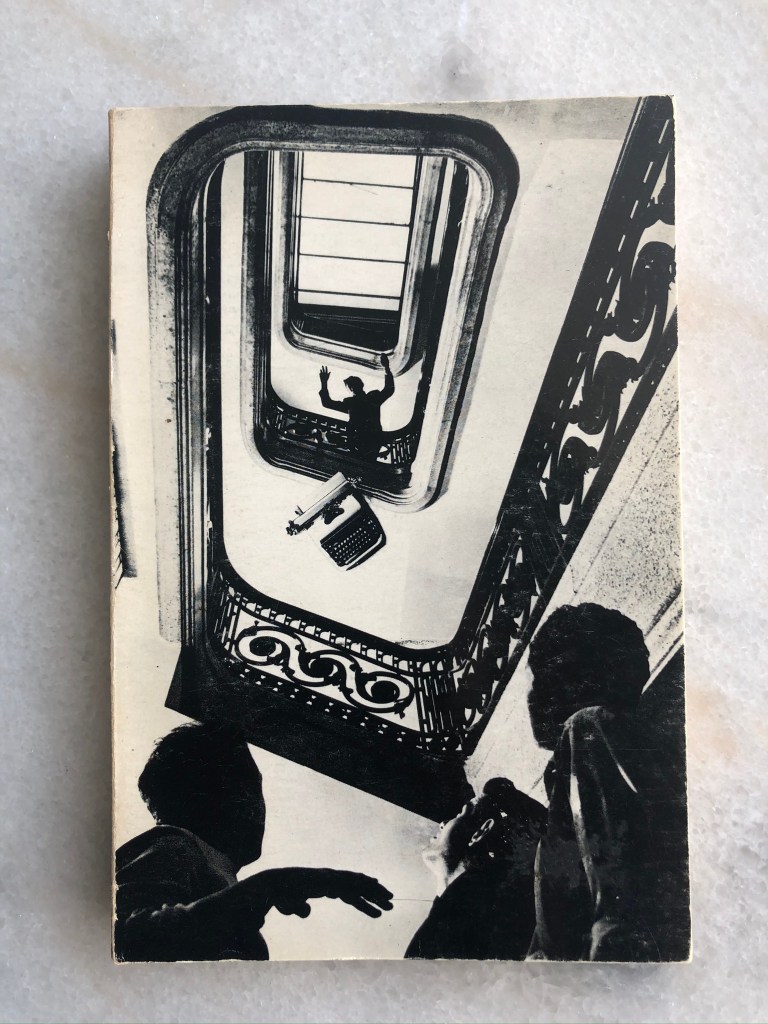 –No. Es un montaje que yo hice, un montaje de la idea de él. Teníamos una máquina Remington en mi oficina, una maquinota. El que la está aparentemente tirando era mi ayudante. Entonces tomé dos o tres fotos del momento. Le dije: haz el gesto como de que estás tirando una cosa pesada. Y entonces tomé dos fotos muy compuestas usando la elipse de la escalera. Y ahí están ellos dos: el de la izquierda es Pedro Miret y el de la derecha es Sally.