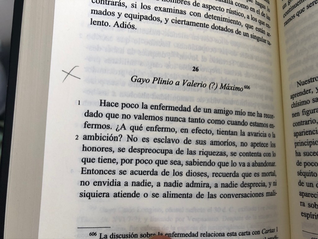 En un estante de la librería El Alquimista, entre un saldo de títulos de la colección de clásicos de Gredos, encontré las Cartas de Plinio el Joven, a quien conocía solamente de oídas. Pero no fue entonces, enero de 2018, sino a últimas fechas, entrado ya septiembre de 2020, cuando he espigado alguna carta intensa o hermosa como aquella en la que el sobrino relata la muerte de Plinio el Viejo, el día mismo de la erupción del Vesubio, para que su amigo Tácito, a quien está dirigida, saque de ella cuanto pueda aprovecharle.