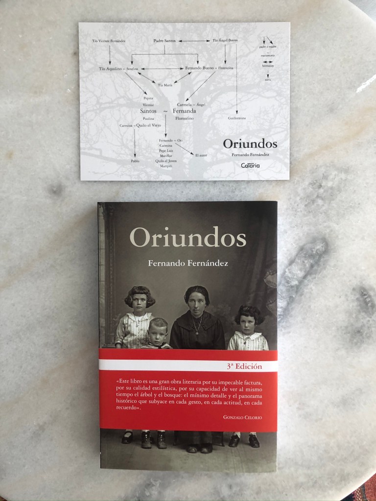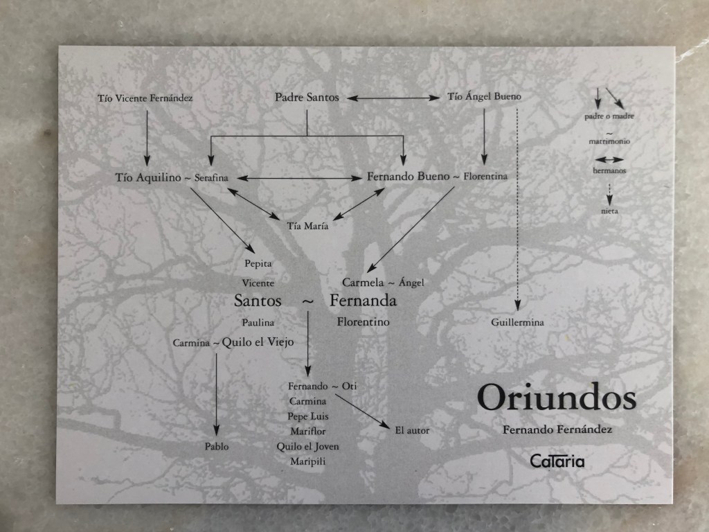 El segundo: la reproducción del árbol genealógico de los personajes al reverso de la postal que reproduce la foto del maestro y los niños de la escuelina, tal como apareció en la segunda edición de Oriundos, la que fue hecha en Asturias. Los lectores tendrán ahora, además de la foto que sirve de columna vertebral de las historias del libro (porque en ella aparecen muchos de los personajes que se mueven en sus páginas), un esquema que les permitirá situarse en el cambiante oleaje de tiempo que los conduce, una y otra vez, de un lado y del otro del Océano.