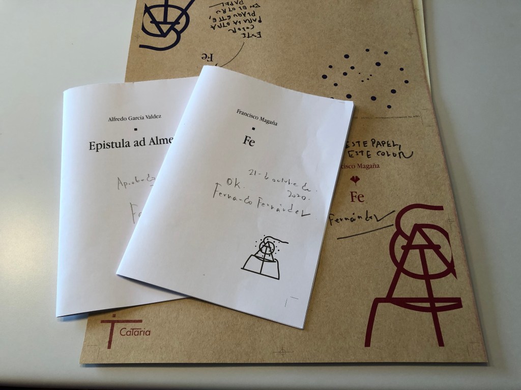 El primero de los dos cuadernillos que se imprimen en tanto redacto esta nota es un homenaje de Francisco Magaña a Vicente Rojo; mezclando poemas con pequeñas prosas narrativas, Fe hace el relato del viaje que el poeta tabasqueño emprendió a la Ciudad de México para estar presente en una exposición del admirado pintor y artista gráfico hispanomexicano, llevada a cabo en la galería de Ramón López Quiroga. El motivo que ilustra Fe es una calca de un dibujo del propio Vicente, trazada, como siempre en las ediciones de Cataria, por la talentosa diseñadora asturiana Lola García Zapico.
