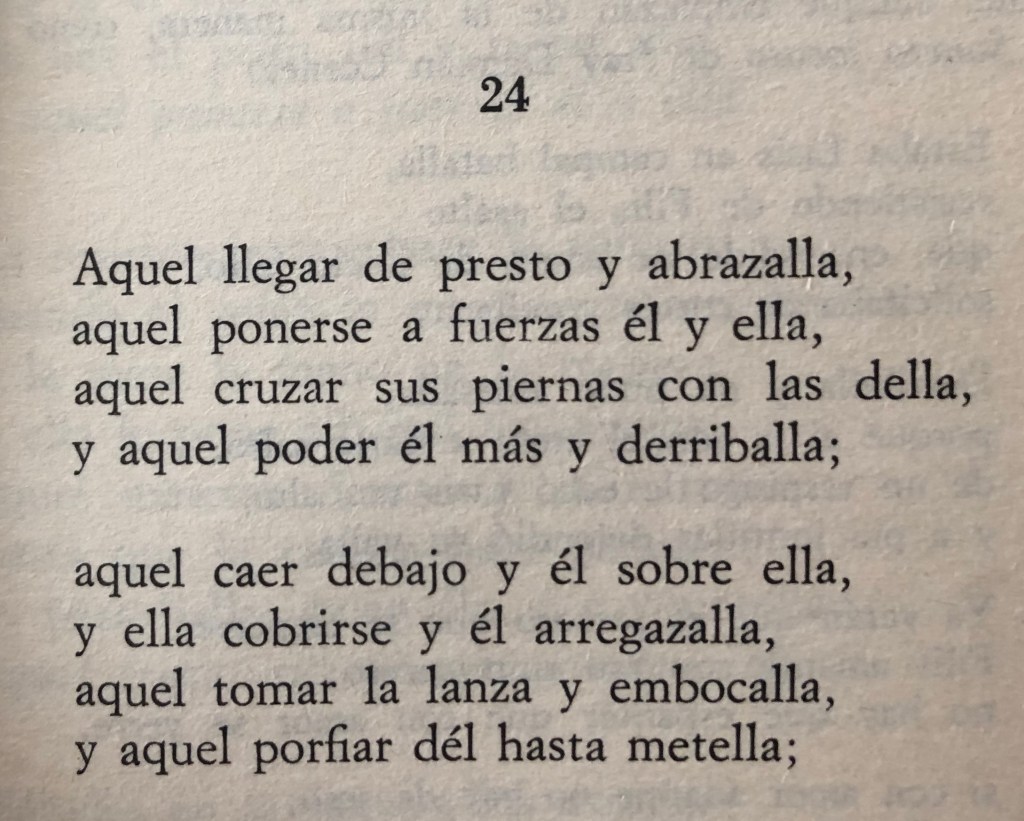 Leo el soneto en la preciosa antología Poesía erótica del Siglo de Oro de Alzieu, Jammes y Lissorgues (Crítica, Madrid, 1984), y lo hago en un ejemplar perteneciente a mi biblioteca, regalo de mi amigo David Huerta. Forma parte de Jardín de Venus, colección de poesías anterior a 1589, fecha del Manuscrito de Alonso de Navarrete de donde fue originalmente recogido y en el cual ocupa el vigésimo cuarto lugar. Quienes lo lean, no me cabe duda, estarán de acuerdo en que es espléndido y me parece que aun lo estarán más quienes lo escuchen leído en voz alta.