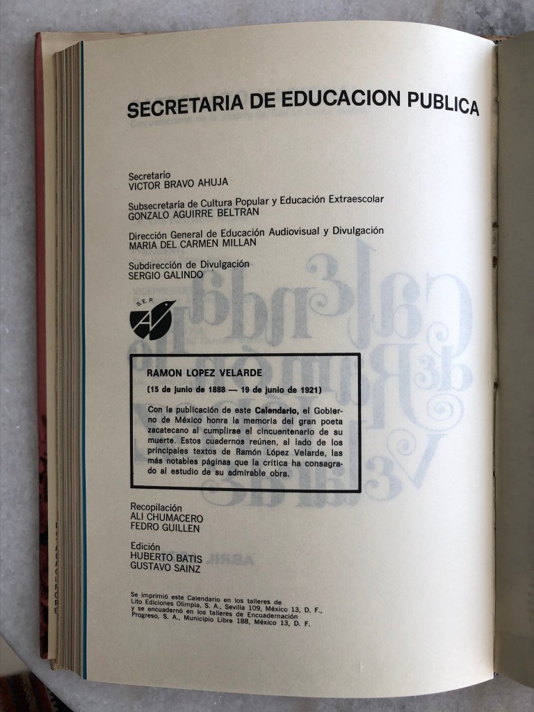 ¡Hola, Bárbara! ¿Cómo están? Espero que bien, cuidándose y trabajando en lo posible. Te quería dar una molestia: ¿te importaría preguntarle de mi parte a Vicente si él diseñó el calendario de Ramón López Velarde que publicó la Sep en 1971, a 50 años de la muerte del poeta? Fueron 12 publicaciones, en forma de revistas o fascículos, una por mes, que publicó el gobierno cuando se cumplió esa efeméride. No hay crédito de diseño gráfico o dirección de arte, pero siento la presencia de Vicente en esas páginas. Sólo quería confirmar esa información. Perdona la lata. Les mando muchos abrazos, llenos de afecto y cariño. FF