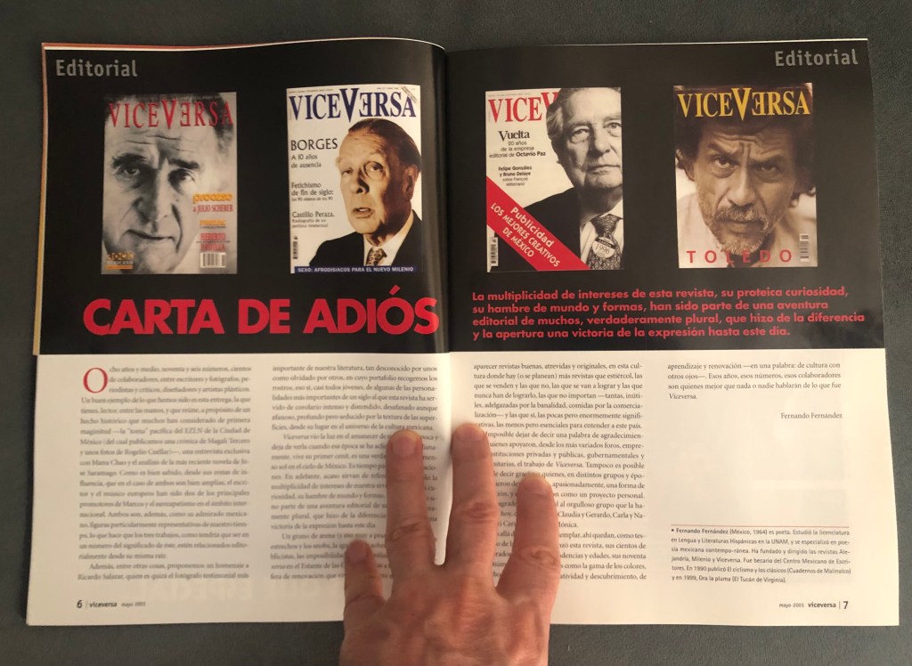 Este mes se cumplieron 20 años de la aparición del último número de Viceversa. Fue en mayo de 2001 cuando salimos a la calle por última vez. Como una manera de conmemorar esa fecha, me ha parecido una buena idea compartir algunas imágenes de aquel número, cuyo índice encabezaban una crónica de Magali Tercero ilustrada con fotos de Rogelio Cuéllar, una entrevista con el cantante franco-español Manu Chao y el análisis de una novela de José Saramago. Entre otros materiales, incluimos un portafolio fotográfico de Ricardo Salazar y un poema de nuestro maestro Eduardo Casar. Acompaño esas imágenes con la Carta de adiós con que entonces nos despedimos de los lectores. Me parece que ese texto habla, aun ahora, dos décadas más tarde, lo que fue, o quizás mejor dicho, de lo que quiso ser nuestra revista.