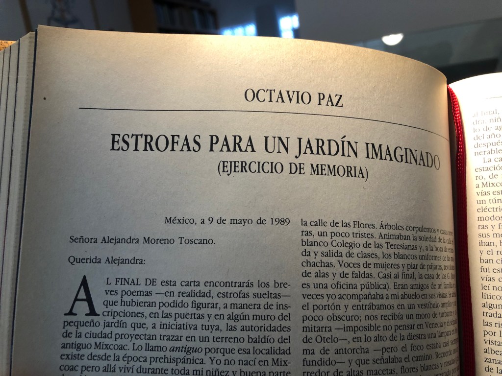 La alusión, en una de las notas del libro de Sheridan, a esa carta fechada el 9 de mayo de 1989 y dirigida a Alejandra Moreno Toscano, funcionaria responsable del proyecto, me llevó a volver a leer el texto de Paz, “Estrofas para un jardín imaginario (ejercicio de memoria)”, el cual apareció en Vuelta, número 153, de agosto de 1989, página 11.
