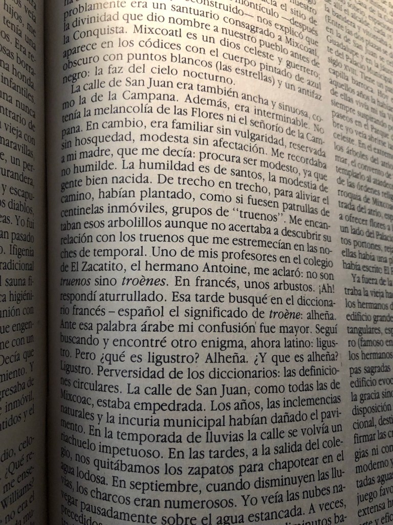 Esa tarde busqué en el diccionario francés-español el significado de troène: alheña. Ante esa palabra árabe mi confusión fue mayor. Seguí buscando y encontré otro enigma, ahora latino: ligustro. Pero ¿qué es ligustro? Alheña. ¿Y qué es alheña? Ligustro. Perversidad de los diccionarios: las definiciones circulares. La calle de San Juan, como todas las de Mixcoac, estaba empedrada. Los años, las inclemencias naturales y la incuria municipal habían dañado el pavimento. En la temporada de lluvias la calle se volvía un riachuelo impetuoso. En las tardes, a la salida del colegio, nos quitábamos los zapatos para chapotear en el agua lodosa. En septiembre, cuando disminuyen las lluvias, los charcos eran numerosos. Yo veía las nubes navegar pausadamente sobre el agua estancada. A veces, presididos por unas burbujas, aparecían diminutos batracios. En la estación seca la tierra era fina y de color ocre. Las canicas trazaban sobre el suelo geometrías fantásticas y los trompos dibujaban vertiginosas espirales.
