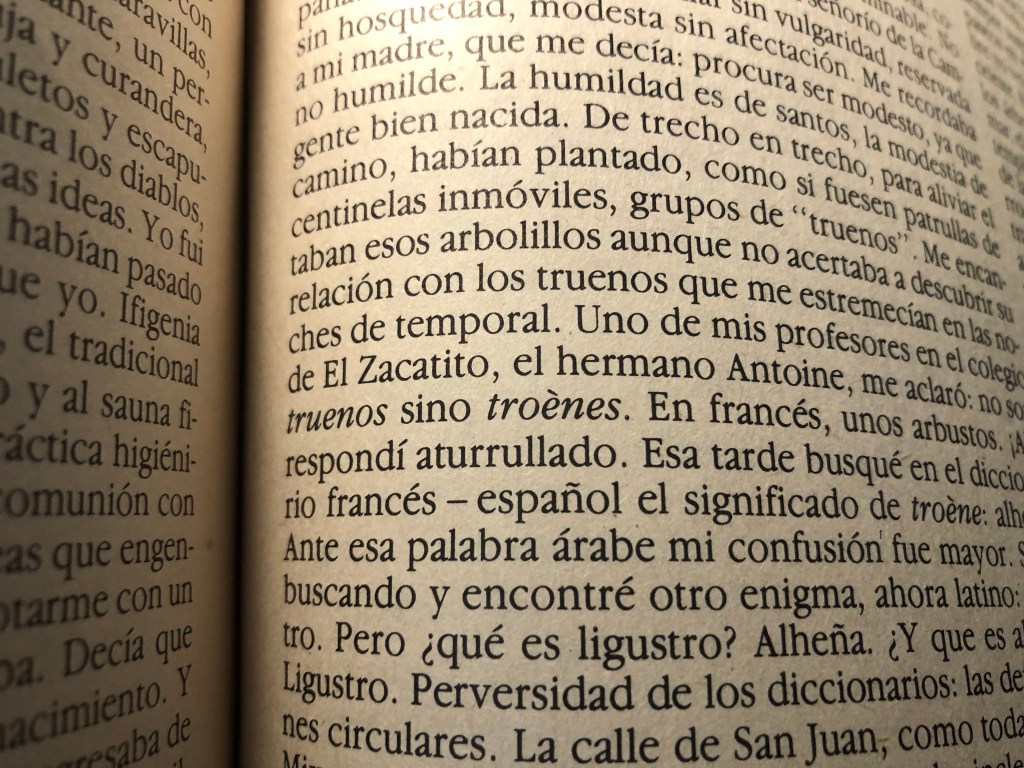“Esa tarde busqué en el diccionario francés-español el significado de troène: alheña. Ante esa palabra árabe mi confusión fue mayor. Seguí buscando y encontré otro enigma, ahora latino: ligustro. Pero ¿qué es ligustro? Alheña. ¿Y qué es alheña? Ligustro. Perversidad de los diccionarios: las definiciones circulares”.