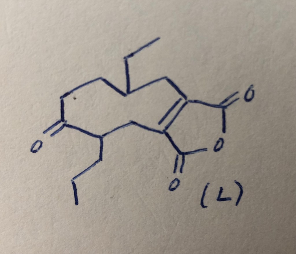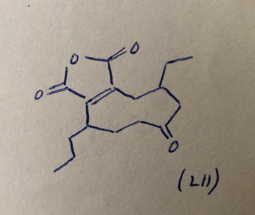 Van con esta entrega de Siglo en la brisa unas imágenes de la edición. El detalle más importante, como siempre, lo aporta Lola García Zapico: para ilustrar los forros, la directora de arte de Cataria calcó unos apuntes de puño y letra del poeta. Todo mundo sabe que Juan Almela tenía debilidad por las fórmulas químicas estructurales: las dibujaba siempre que podía, como un entretenimiento, por ejemplo después de comer, con la pluma de la que siempre se acompañaba, sobre el mantel de papel del restaurante El Habanero de la colonia Nápoles donde comimos en compañía de Fernando Rodríguez Guerra tantos viernes de mediados y finales de la década de 1990. En el archivo personal del poeta se conservan muchísimos ejemplos. He aquí un par de muestras, las que tienen que ver con la edición de Biloba.