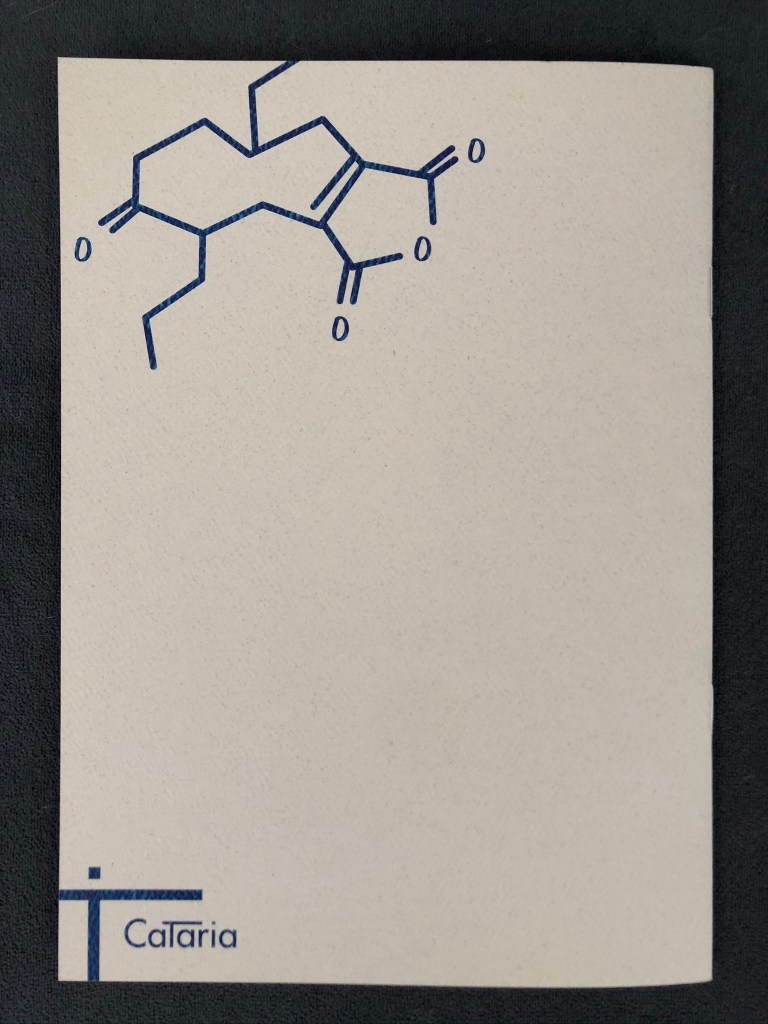 Hermosas publicaciones de Cataria, realizadas con muy buen gusto, con temas de gran interés, fáciles de leer. En este caso, la idea genial de la artista Lola García Zapico, de calcar en la portada, fórmulas químicas, que tanto atraían a Juan Almela, con todo ello se logra una gran edición. Felicidades.