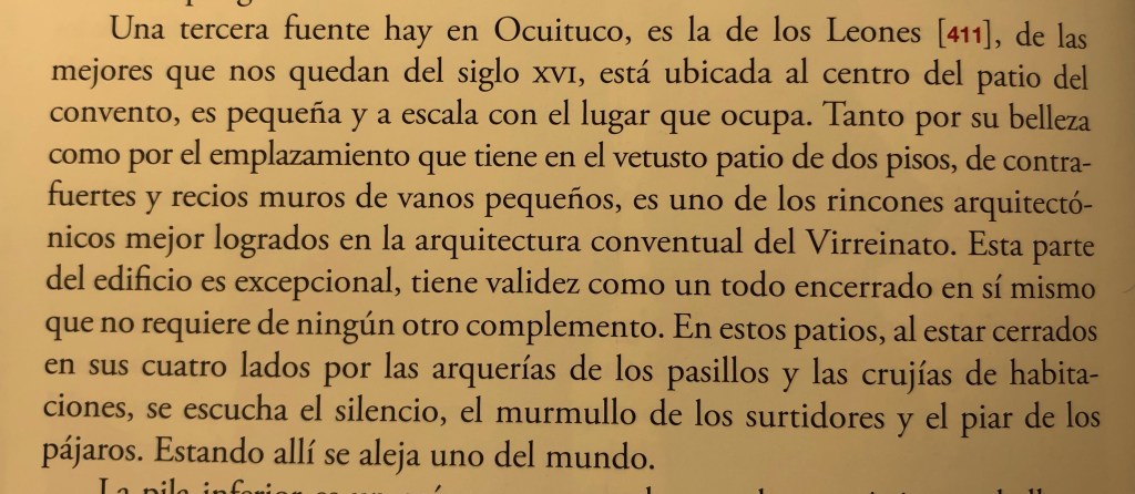 ¿Lo tenía presente, aunque sin acordarme, cuando visité Ocuituco por segunda y última vez, en el invierno de 2014? ¿O fue más bien que coincidimos, el viejo arquitecto amigo de mi padre a quien tuve el gusto de entrevistar alguna vez en mi programa de radio, precisamente a propósito de su libro, y yo, en la percepción de aquel portentoso espacio, que él describe nada menos que como “uno de los rincones arquitectónicos mejor logrados de la arquitectura conventual del Virreinato”?