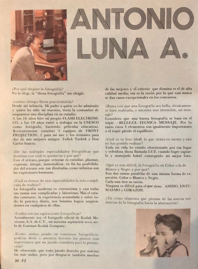 No hemos podido llevar esta búsqueda a un feliz término. Rodrigo Moya, quien recordó haberlo oído mencionado, dirigió mis pasos a Ramón López Quiroga, a quien, en cambio, no el nombre no le dijo nada. Unos días más tarde, sin embargo, mi amigo galerista, gran conocedor y coleccionista fotográfico, me buscó para decirme que en una vieja entrega de la revista Foto Zoom acababa de dar con él, o al menos con un posible homónimo. En efecto, en el número 18 de aquella publicación, de marzo de 1977 (este año es un cálculo, porque el cabezal de la revista oculta ese dato específico) apareció una entrevista con un fotógrafo llamado Antonio Luna A.