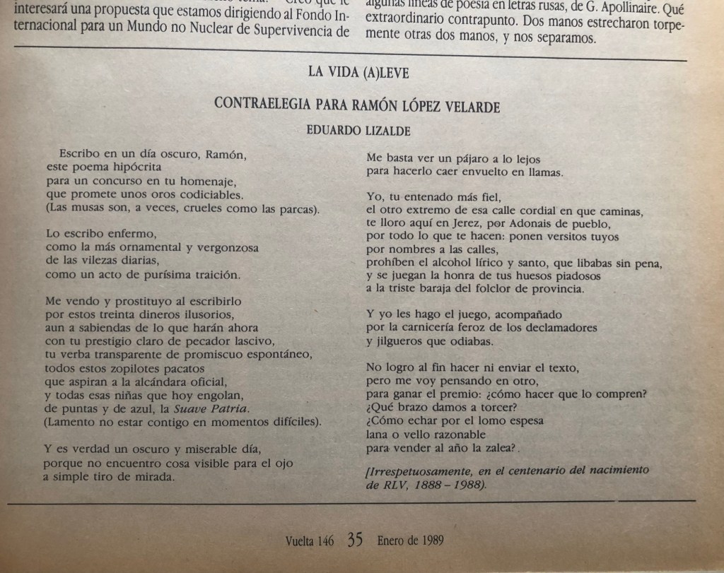 Para mi amigo, lo mejor del poema, cuyo título es “Contraelegía para Ramón López Velarde”, es el verso “yo, tu entenado más fiel”, apreciación con la que estoy de acuerdo, y lo peor, al menos para quien esto escribe, la que nos parece una errata que los redactores de Vuelta dejaron ir, cosa que, hay que decirlo, no era infrecuente en la revista de Octavio Paz, aun cuando los poemas fueran breves o sus autores gozaran del sincero afecto de su director.