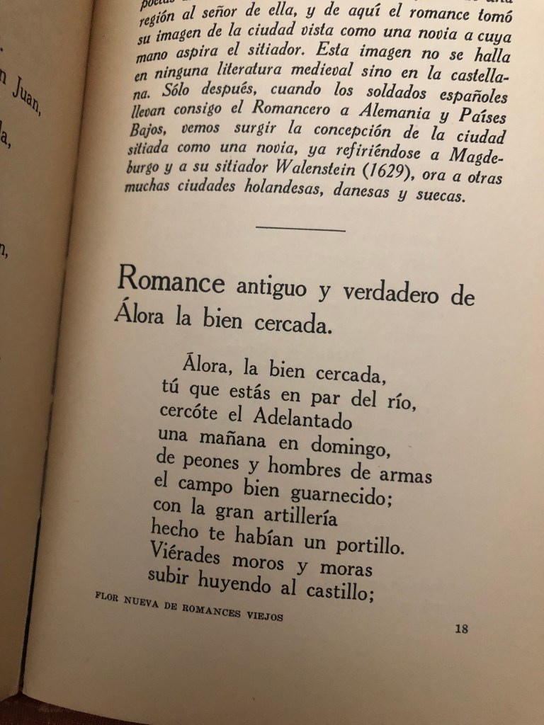 Fui al librero para traerlo a mi mesa de trabajo, todavía antes de buscar el poema de Reyes, cuyos respectivos arranque y desarrollo tenía olvidados, siquiera por darme el siempre renovado gusto de volverlo a leer. Si no falta en ninguna de las antologías de romances que tengo a la mano, que alcanzan casi una decena, preferí releerlo en mi ejemplar de Flor nueva de romances viejos de Ramón Menéndez Pidal de la edición de Espasa-Calpe de 1938, uno de los diez libros que salvaría de mi biblioteca, y que, como conté en otra ocasión, rescaté milagrosamente de una caja colocada a un lado de los botes de la basura del edificio donde vivo.