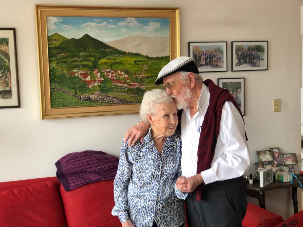 Él, 88 años; ella, 86 (ambos en perfecta salud). En la pared, a sus espaldas, una vista de Asiego de Cabrales pintada al óleo por mi primo Daniel en 1976, año de nuestra primera visita al pueblo.