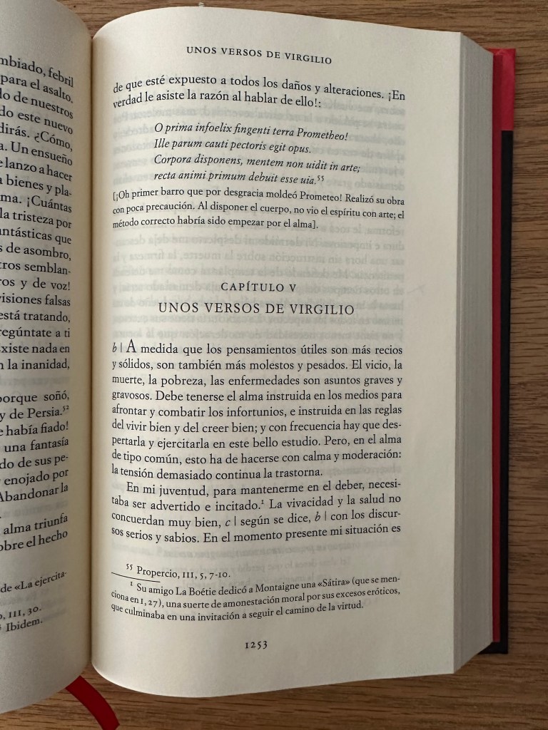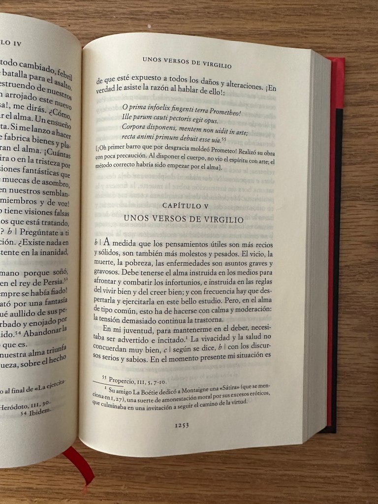 Así que aquí tienes mi respuesta, querido Jose. Si quieres saber lo que Montaigne pensaba sobre el amor, te recomiendo que abras su libro por cualquier página y lo leas libre y azarosamente, demorándote todo lo que puedas en él; aquí, allá, encontrarás lo que pensaba sobre infinidad de cosas, y entre ellas, más pronto que tarde, aunque frecuentemente de paso, en diversas ocasiones, el amor. Pero si te sientes impaciente por llegar a lo que sabía o decía sobre ese tema en específico, abre los Ensayos y acude directamente al titulado “Unos versos de Virgilio”, que puedes leer desde la página 1253 en la edición de Acantilado que tenemos los dos.