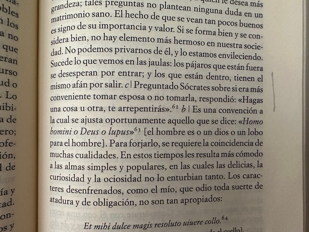 Imposible enlistar siquiera en este breve espacio todos los temas acerca de los cuales dice algo: sobre si puede existir el amor en el matrimonio, o sobrevivir siquiera la llama sexual en ese apretado estado civil; sobre la educación de las mujeres; sobre el miembro viril; sobre los celos y la envidia; sobre el deseo; sobre la infidelidad y los cornudos; sobre la utilidad de la pasión amorosa en la edad madura; sobre los sueños; sobre las diferencias que hay en la pasión amorosa entre los españoles y los italianos… Para ello, además de su rica experiencia propia, y de su asombrosa capacidad de análisis, acude a Ovidio, Petronio, Marcial, Platón, Cicerón, Séneca, Horacio, Plutarco, Diógenes Laercio, Aristóteles, Lucrecio, Virgilio (por supuesto), Juvenal, entre otros… Esto es, a una serie de autores de la Antigüedad muy representativa de los más de cincuenta, nada menos, que Montaigne conocía y manejaba a la perfección, según el erudito análisis de Pierre Villey (otro día te hablaré de Pierre Villey).
