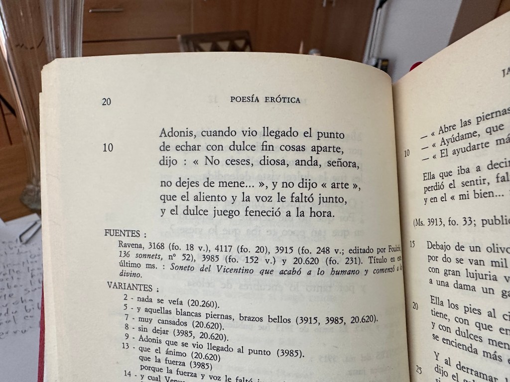 Como se ve, el soneto se ocupa del tema de la culminación amorosa que arrebata a los amantes al grado de quitarles el uso de la palabra. Para aquella muchacha, la lectura del poema (los ojos en blanco de quienes están absortos en el acto sexual, la boca helada por su violento inhalar y exhalar, el uso del verbo “menearse”…) fue una especie de pequeña epifanía: si la poesía clásica era capaz de crear algo tan ingenioso y divertido, quizás valía la pena prestarle alguna atención.