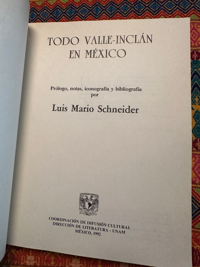 A los relatos, artículos, textos memoriosos y poemas que escribió o publicó Valle-Inclán en Veracruz y la Ciudad de México, Schneider añade los materiales periodísticos, fotográficos y críticos que es necesario tener en cuenta para conocer a profundidad el modo en que transcurrieron las dos estancias mexicanas del autor de Sonata de estío, sin dejar fuera una reproducción fotográfica de las cartas intercambiadas con Alfonso Reyes y Genaro Estrada ni las caricaturas que de su persona se publicaron en la prensa de la época (las muchas que provocaba por donde asomara su singular figura).