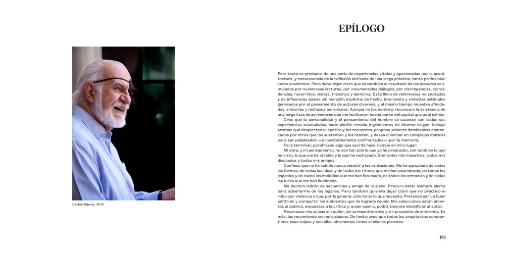 La manera en la que, por decirlo en términos arquitectónicos, desplantó este libro, es un ejemplo significativo de cómo pensaba Carlos Mijares. En la solución editorial que le dio, en el plan general de su estructura, en su lógica toda, hay una prueba de su modo de relacionarse con su oficio, del que fue uno de los grandes maestros de las últimas décadas en México.
