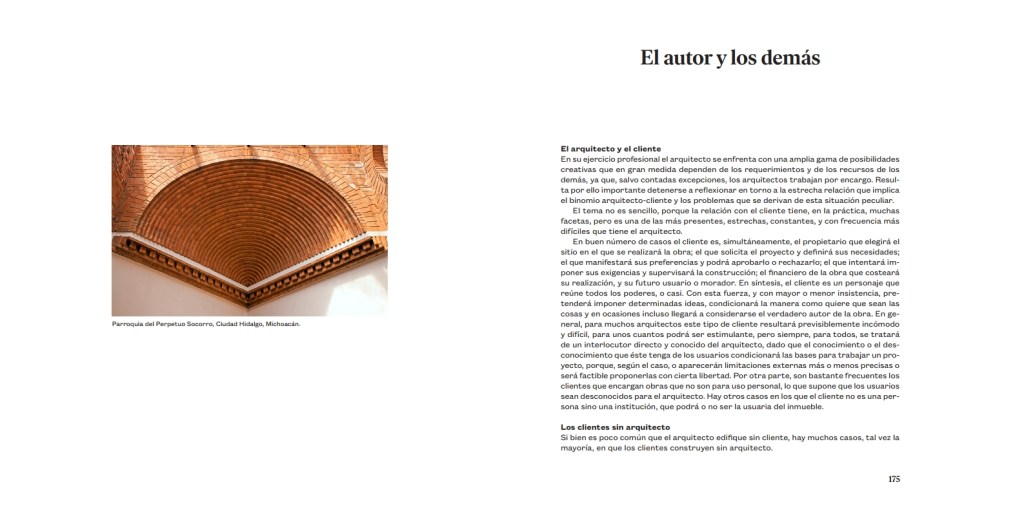 El desplante del libro, en el que está puesta en práctica la necesaria integración de las diversas escalas a las que se refería el maestro, pero también el afecto por los materiales al que solía referirse, y hasta su interés en los procesos constructivos, ha sido concebido de ese modo con el propósito de que transitemos por sus espacios bajo las mejores condiciones y todo ello nos comunique el deseo de demorarnos en sus páginas. En el camino, en el tránsito, pero especialmente en la demora, se consigue su objetivo final, que no es sino el efectivo e incluso gozoso aprendizaje del oficio arquitectónico.