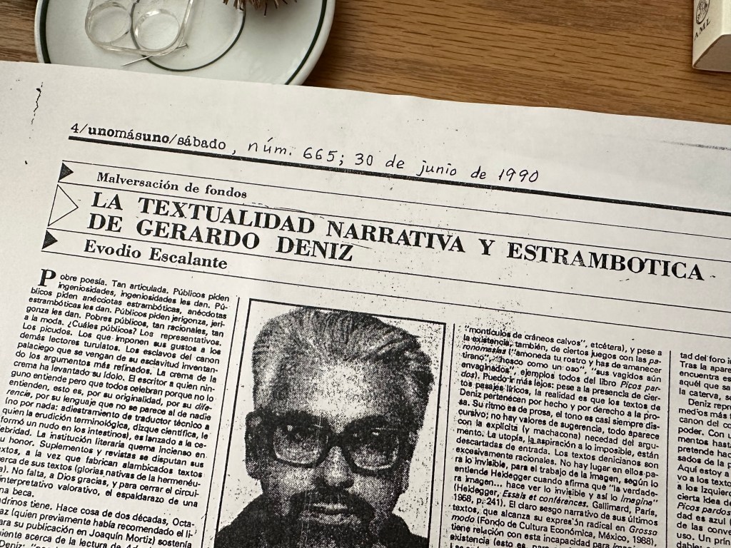 El 30 de junio de 1990, el crítico y ensayista Evodio Escalante publicó un artículo de tintes cargadamente polémicos donde afirmaba que la obra de Gerardo Deniz no podía ser considerada poesía. A éste el señalamiento le vino como anillo al dedo porque le permitió manifestarse, a partir de entonces con una referencia específica, como radicalmente ajeno al paisaje poético del país. Este capítulo expone el episodio y analiza la literatura con que el poeta de Adrede respondió al estímulo del crítico.