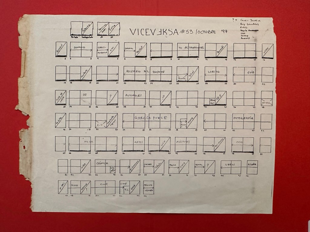 No dudo que el documento que encabeza este artículo resulte extraño a quienes no están el tanto del modo en que se hacían las revistas aún a finales del siglo anterior, poco antes de que el mundo cambiara, sobre todo como lo ha hecho desde la llegada de la cultura digital. La retícula, como llamábamos al documento, servía para poner en papel la secuencia en que habrían de presentarse los textos, las imágenes y los anuncios publicitarios del número en preparación. Era el conducto a través del cual los editores de la revista informábamos a nuestros diseñadores gráficos del orden que debía seguirse para la disposición de los materiales. El mapa que había de regirnos a unos y otros durante el proceso editorial. Todavía sonriendo delante del singular documento, al exhumarlo del sitio en donde estuvo durante el último cuarto de siglo, me pregunté por la causa que me hizo conservarlo. ¿Por qué no se fue al bote de la basura como lo fueron todos los que hicimos durante los ocho años y medio que publicamos Viceversa?