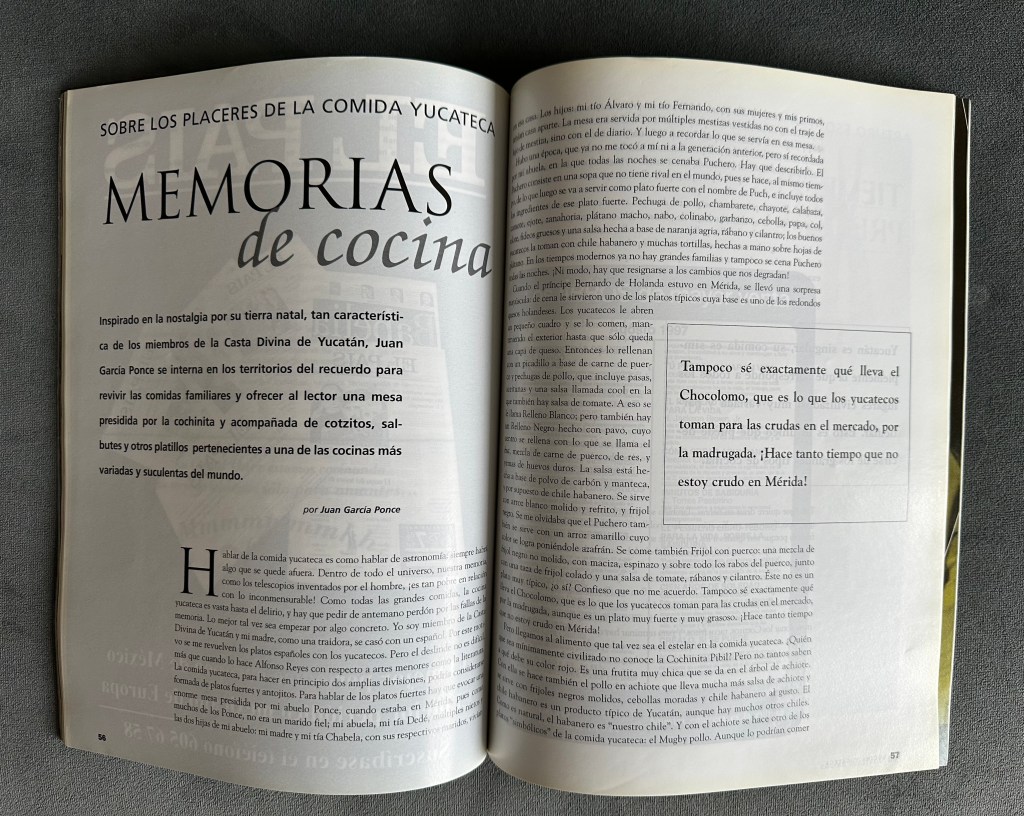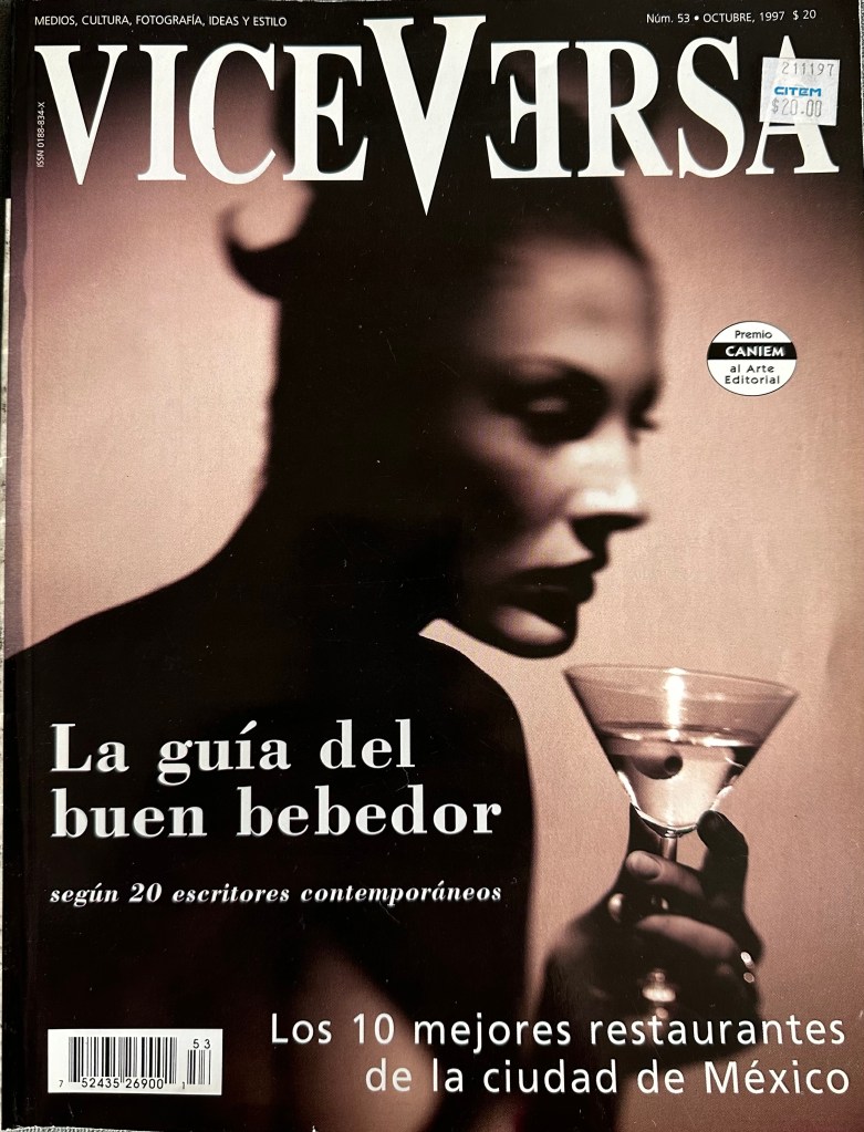 En lo que me planteo la pregunta, reconozco la letra de la gran editora Mónica Braun, en esa época responsable de la revista —época dorada, por cierto, cuando el equipo estaba conformado por ella y los talentosos Roberto Max Erhsam y Fernanda Solórzano, Israel Galina Vaca y Soren García Ascot—. Como puede saberse por la información que ofrece la retícula, el número 53 de la revista, aparecido en octubre de 1997, fue dedicado a asuntos gastronómicos en su sentido más amplio y generoso. Los temas principales fueron, en este orden, los siguientes: una selección de los diez mejores restaurantes de la Ciudad de México sacada en claro por Felipe Jiménez García-Moreno a partir de la opinión de un grupo selecto de amigos de la revista, entre quienes estaban la actriz Ofelia Guilmáin, el publicista Enrique Gibert, el artista José Luis Cuevas y el banquero Adolfo Lagos Espinosa; una muestra del Recetario del Quijote confeccionada para nosotros por el propio Felipe Jiménez García-Moreno y su hermana Marta, y que luego aparecería en forma de libro bajo el sello de la editorial que hacía Viceversa; una guía escrita por algunos conocidos autores para adentrarse en la naturaleza y los secretos de las principales bebidas alcohólicas, coordinada por Hernán Lara Zavala, que incluyó firmas como Gonzalo Celorio, Ernesto de la Peña, Mónica Lavín, Carlos Montemayor, Gerardo Deniz, Eduardo Casar o Paco Ignacio Taibo I; por último, un ensayo de Juan García Ponce sobre la comida yucateca.