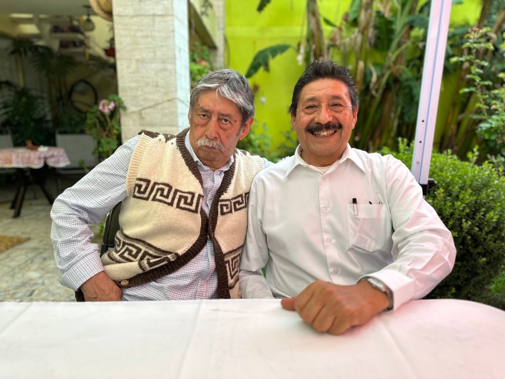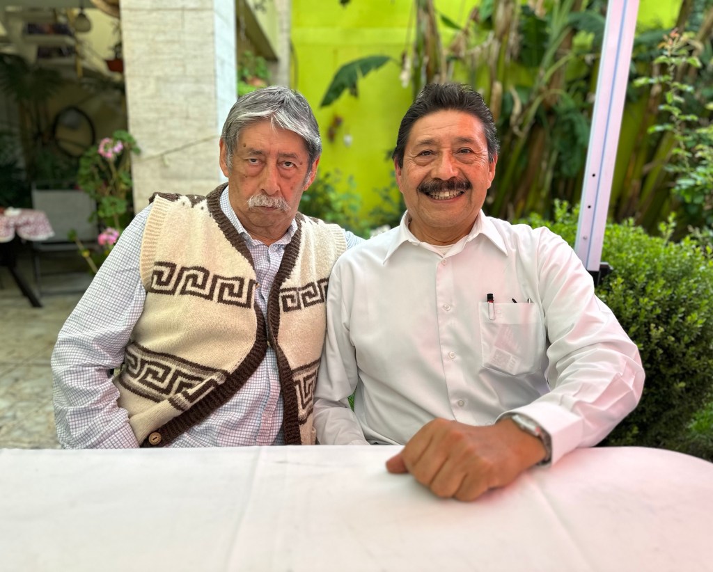 En la foto, los hermanos Orlando y Sergio Delgado Delgado, de Chiconcuac, Estado de México, después del formidable mole verde con que nos agasajaron, cocinado por la esposa del segundo de ellos. Orlando, que es matemático y meteorólogo, luce un chaleco de lana tejido en el taller tradicional de la familia, negocio que Sergio encabeza. Las imágenes fueron captadas el lunes pasado.