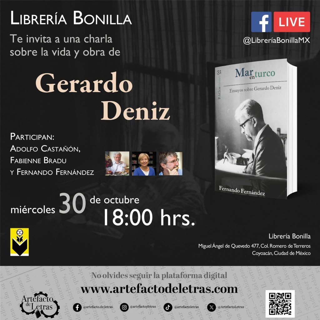 Este miércoles, día 30 de octubre de 2024, a partir de las seis de la tarde, en la librería Bonilla, conversaremos sobre la vida y la obra de Gerardo Deniz, a propósito de la publicación de Mar en turco, mi libro dedicado al gran poeta hispanomexicano. Gracias a Fabienne Bradu y Adolfo Castañón por aceptar acompañarme.
